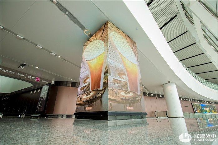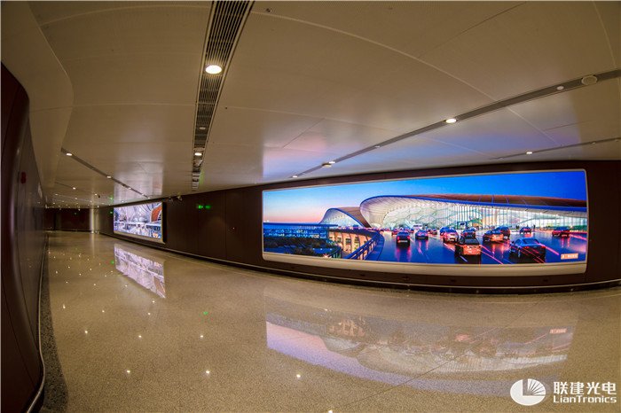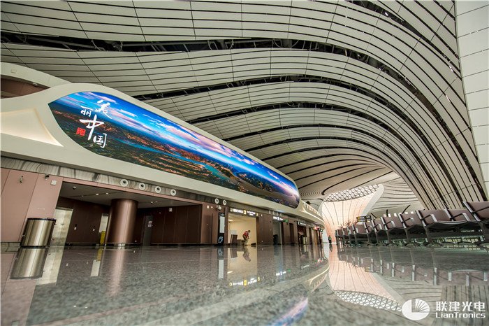在大兴机场内,联建光电LED显示大屏以『高密度、高清晰、高精准』等特点完美展现了机场良好风貌,为旅客人群带来舒适视讯体验。