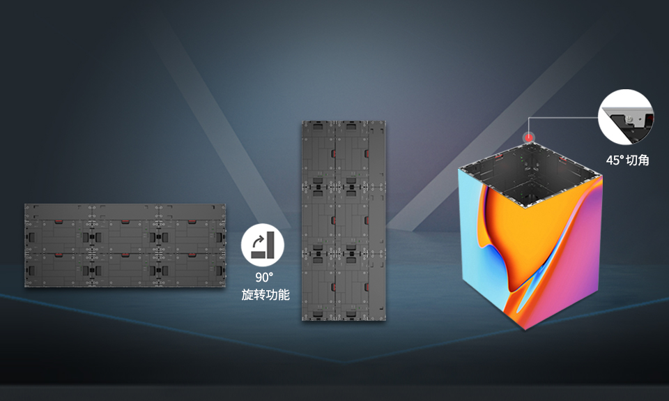 支持箱体90°旋转,旋转后不偏色;支持直角、方柱等不同形状无缝拼接,满足多种创意拼接需求。